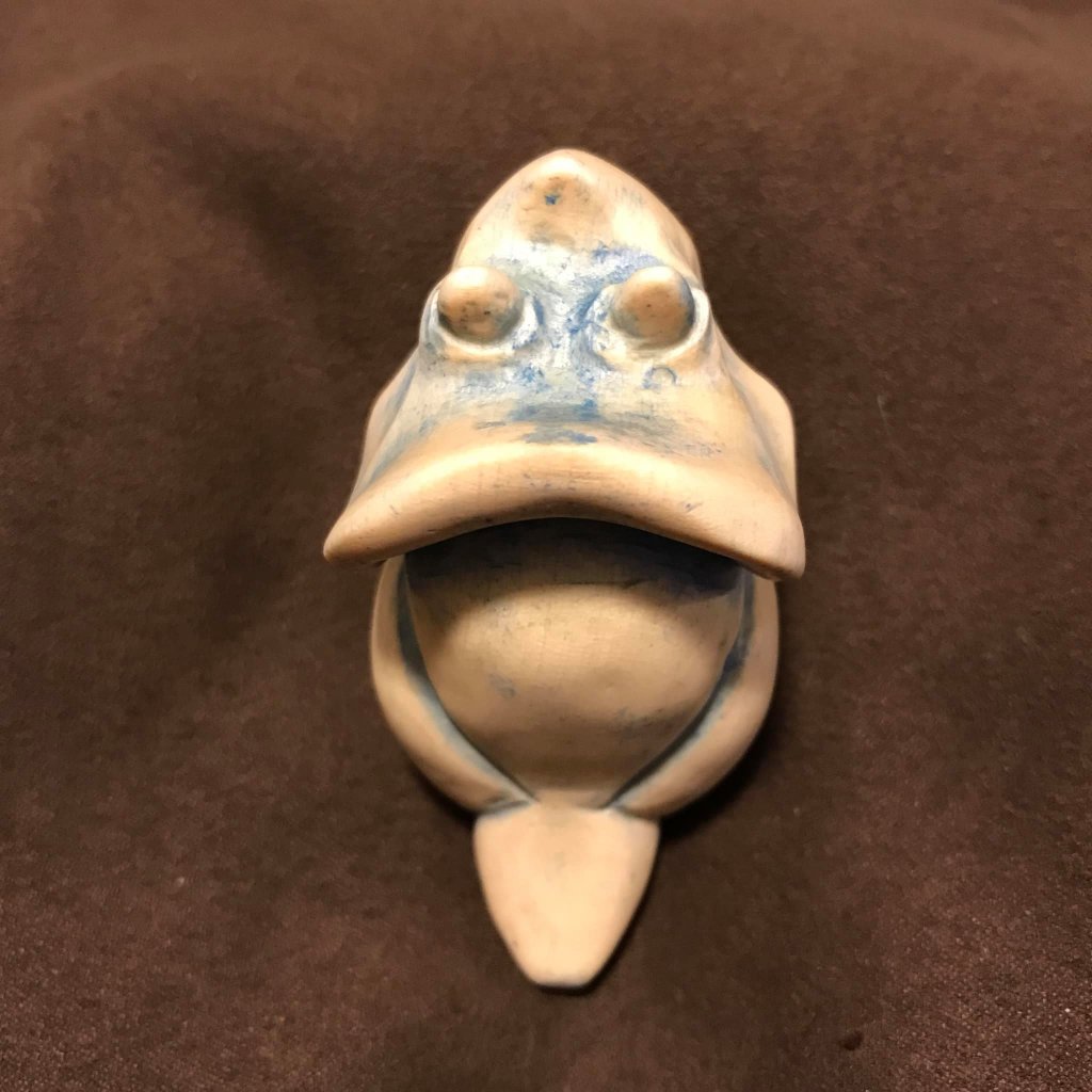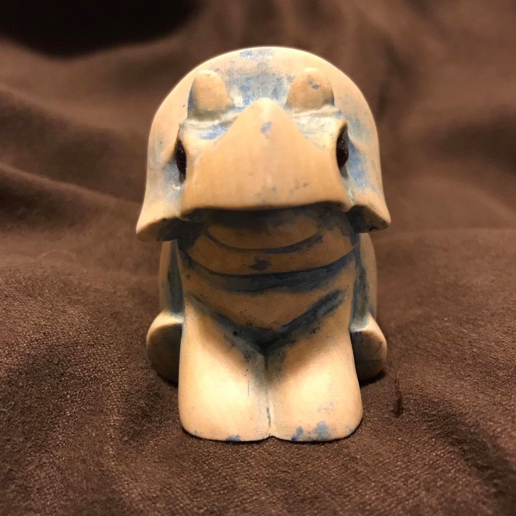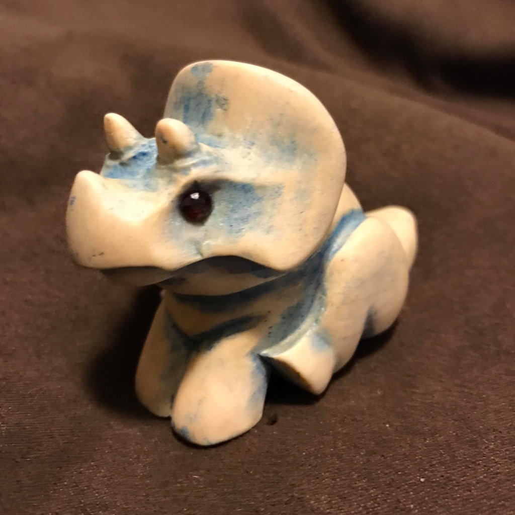 Carving: Blue Triceratops Basswood Triceratops, stained with a blue wash, set with faceted garnet eyes. This little chonker was a gift for a friend.