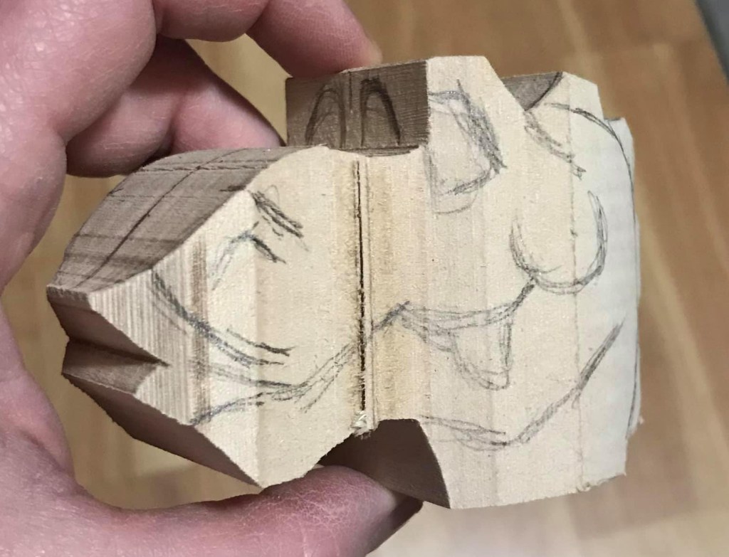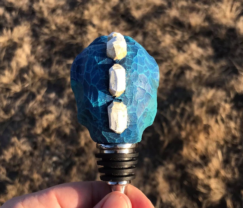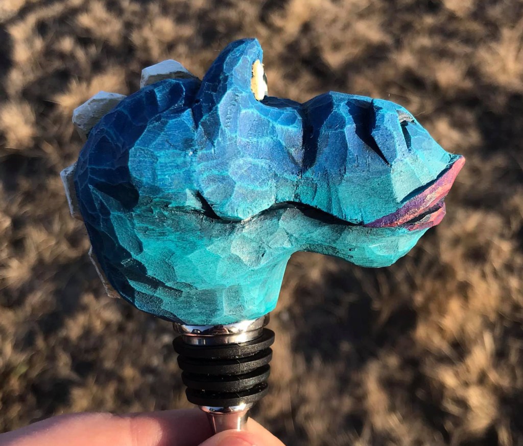 The Wino Dino I is carved from basswood, and painted with acrylics. Fastened to a chrome bottle-stopper. I was doodling goofy cartoon dinosaurs, and came up with a tyrannosaur with big lips. She kind of reminds me of “Fran” from Jim Henson’s “Dinosaurs” TV show that aired during the 90s.