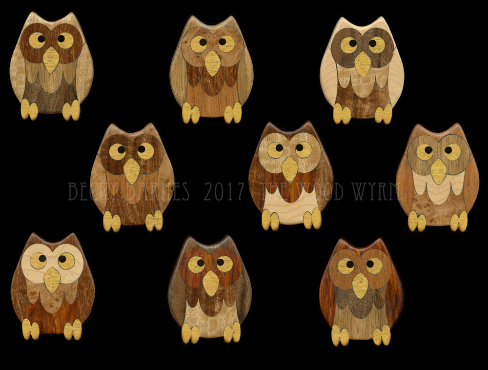 This wee owl has a lot of flexibility with wood choices. For consistency I use ebony and yellowheart for the eyes / beak / toes, but otherwise it’s a mix-and-match for the rest. Pick specific woods, or take a random assortment.