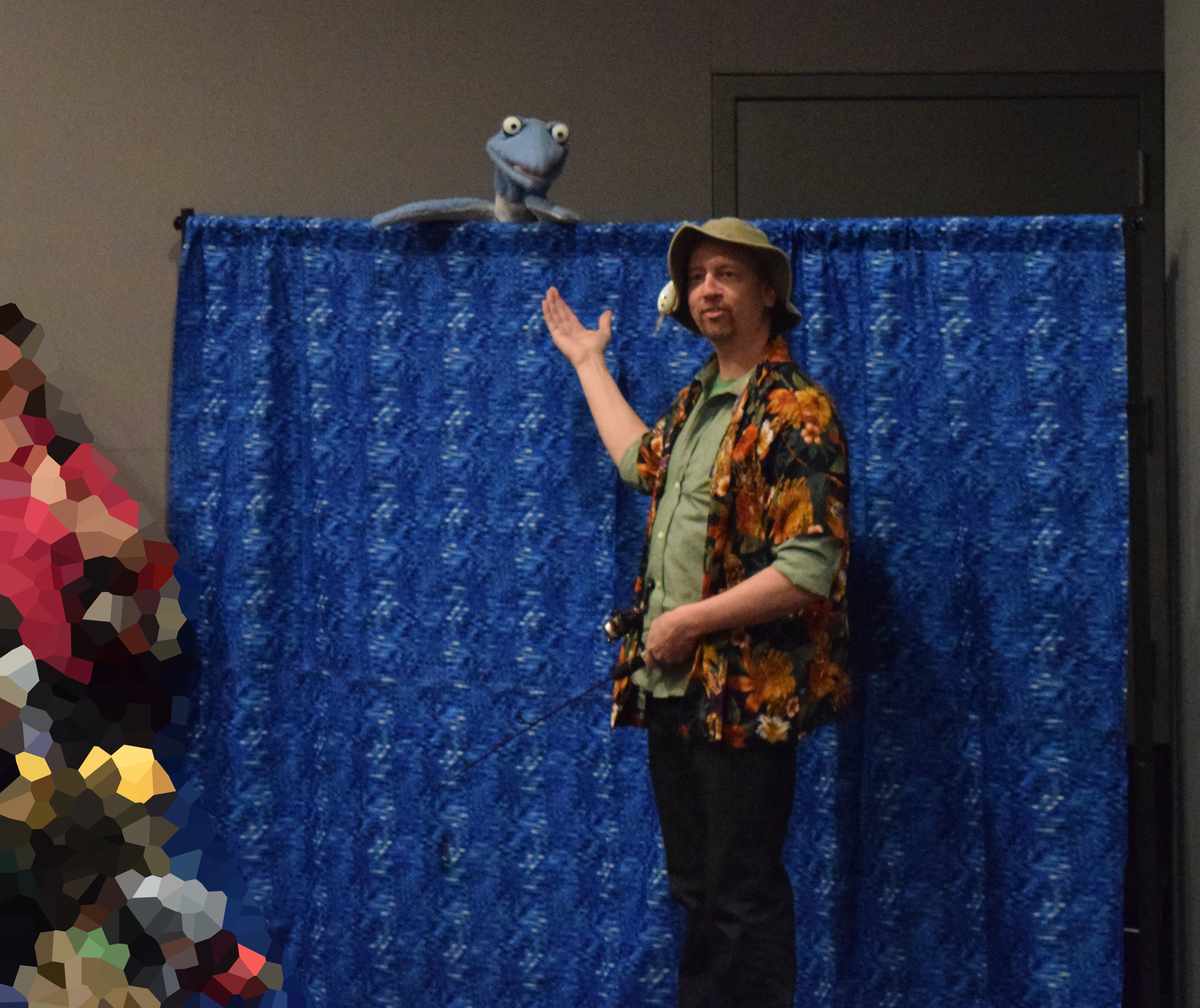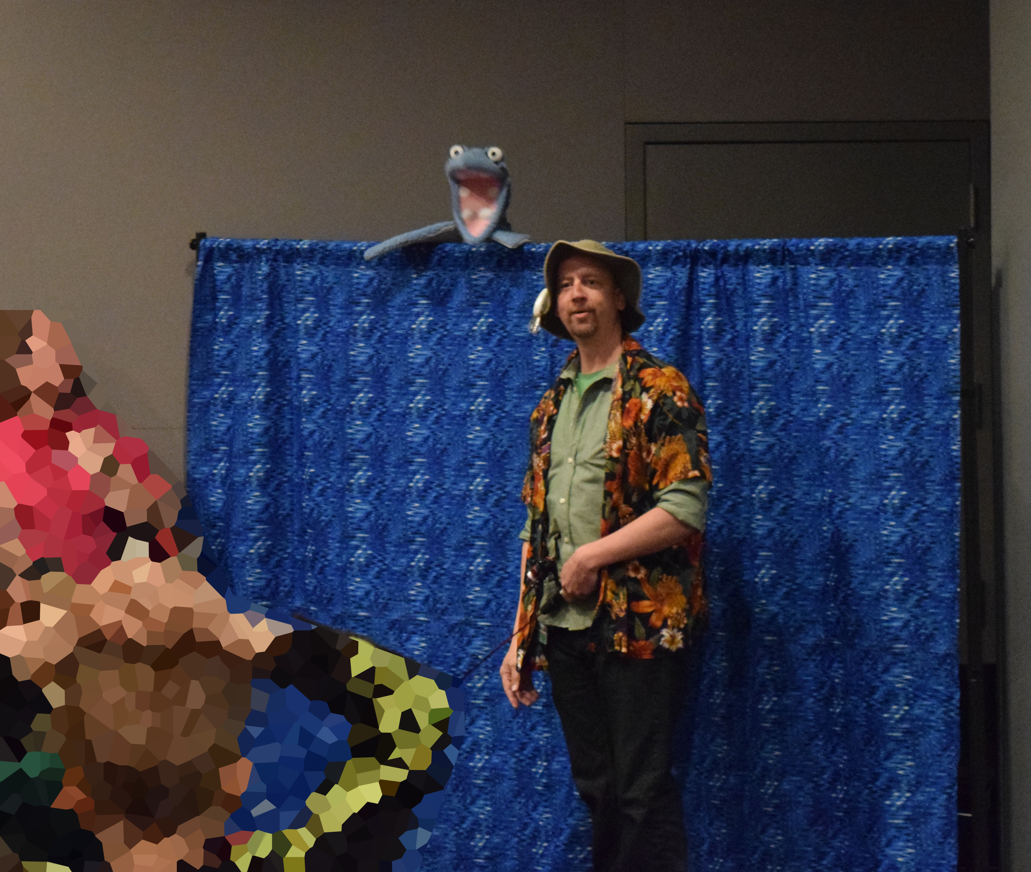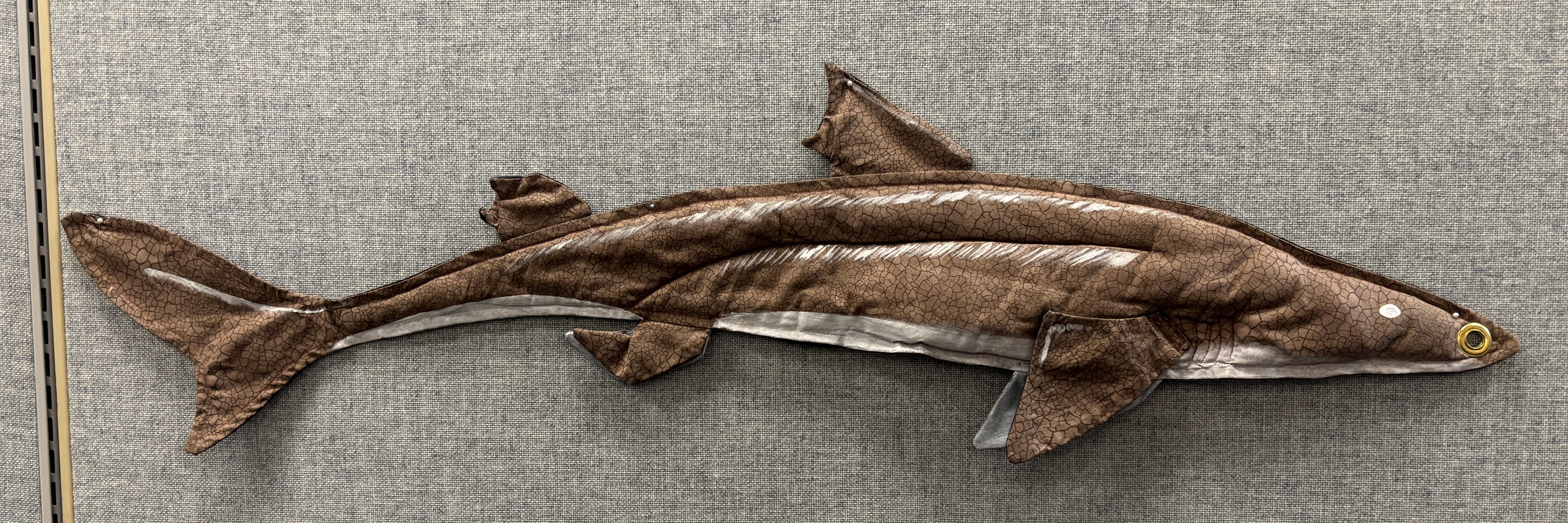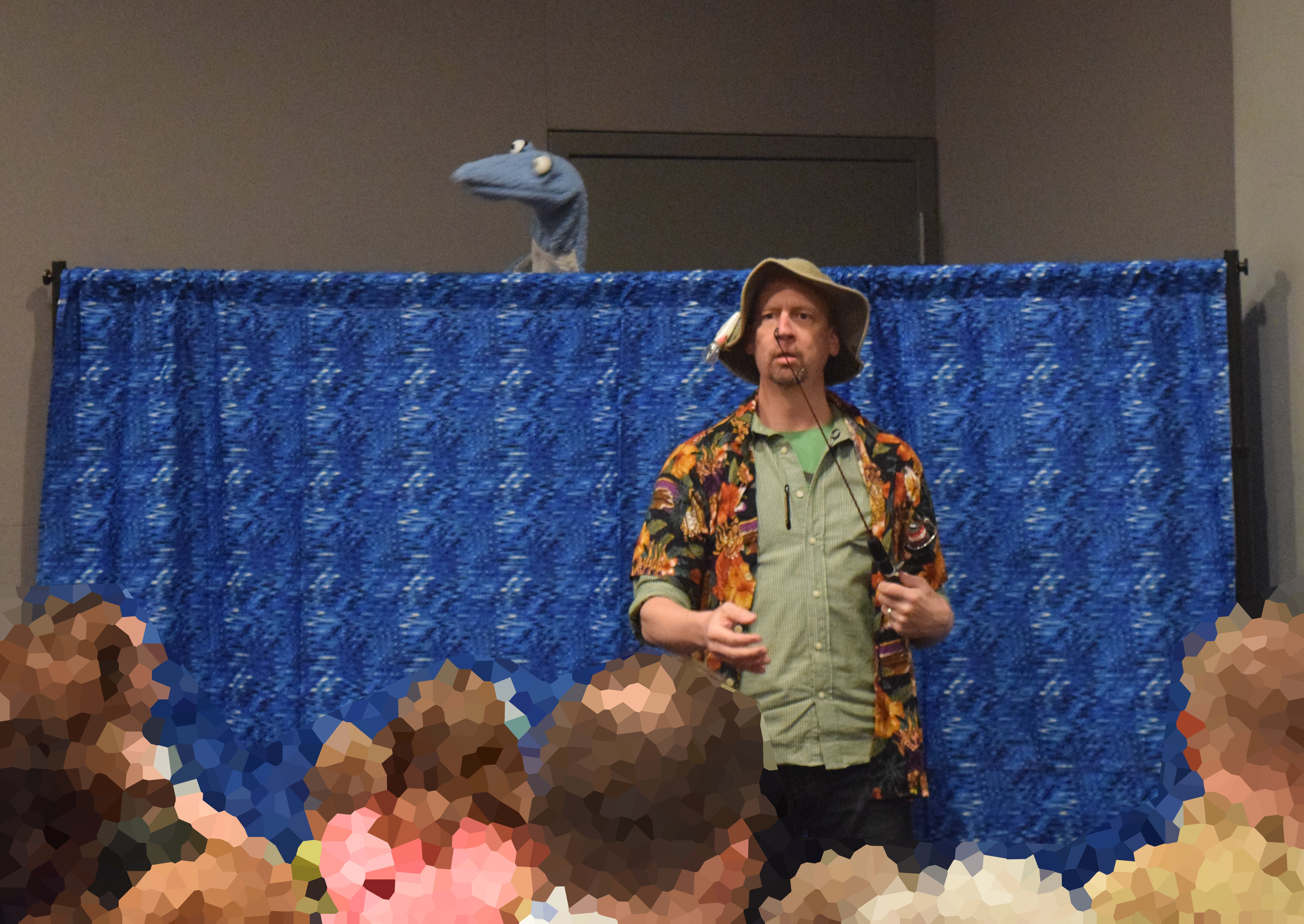 The puppet became a staple for the “Prehistoric Fishing” presentation / activity. One paleontologist would “fish” with a small fishing pole tipped with a carabiner, and the other paleontologist (me) would hide behind a screen and attach quilted and painted life-size fish onto the “hook.” Periodically, something stole the bait…