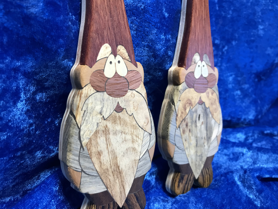 A couple of gnome variants. Blue pine (clothing), black walnut (pants), bocote (boots), spalted maple (left beard) buckeye burl (right beard), bloodwood (hat), lyptus (face), alder (skin), holly (eyes).