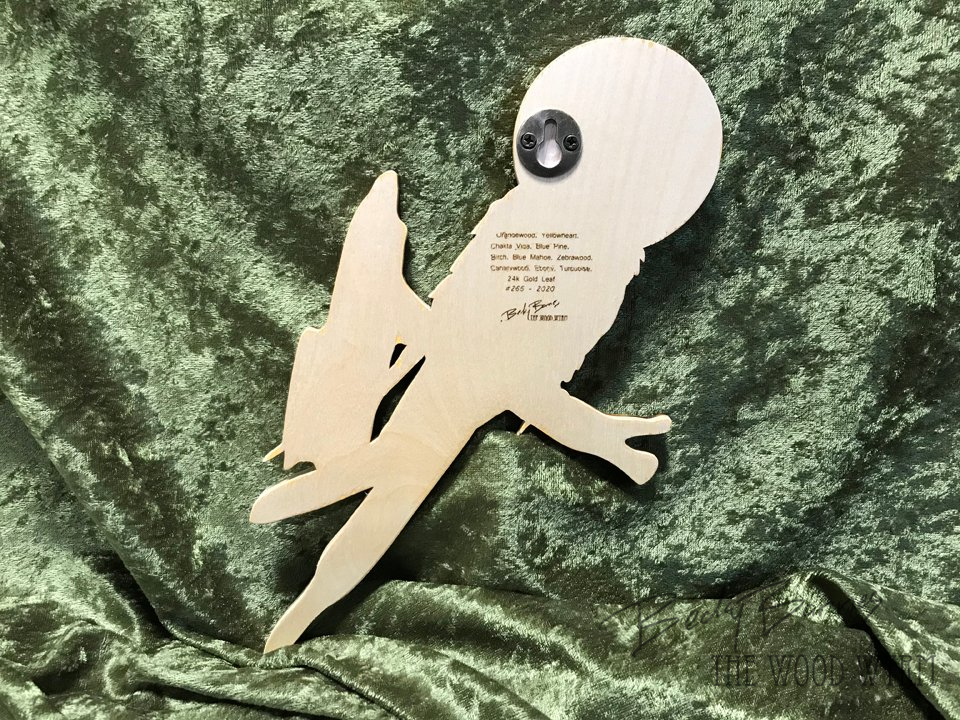 Osage orangewood, Chakta Viga, Yellowheart, Birch, Canarywood, Blue Pine, Blue Mahoe, Zebrawood, Ebony, Turquoise, 24k Gold Leaf.